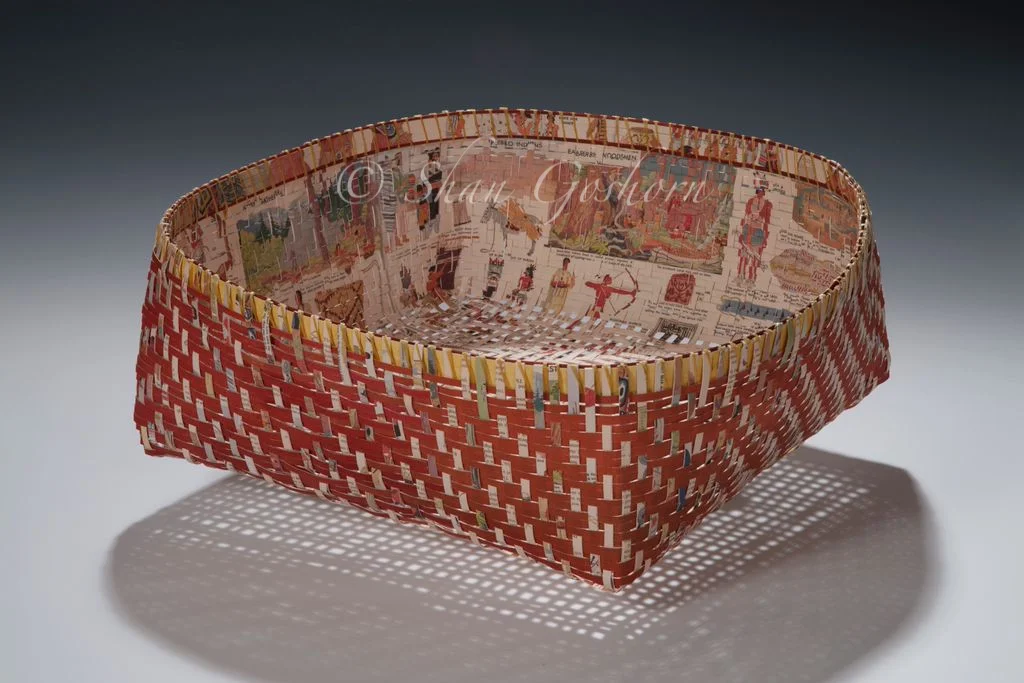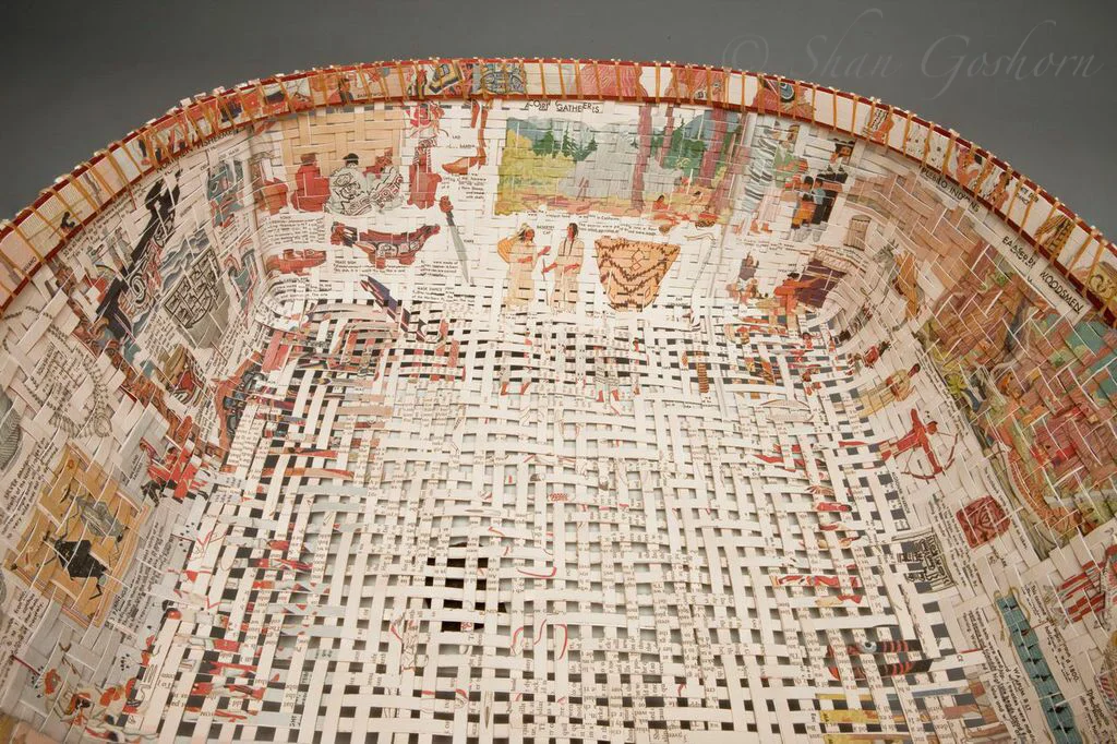 These splints are printed with illustrations and text from 1960‘s reference books about Indians. This is the way that American students learned about Indians when I was in school- information that still seems to be currently taught to children around the world about Native cultures today. This basket is meant to show that Indian people need to actively decide how we want to portray ourselves; we need to actively filter through the misperceptions and untruths.
